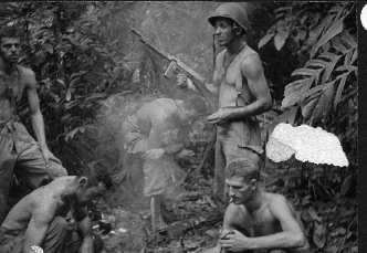 Around Company B HQ Hut Lloyd Sparks (Detroit), John Hendrickson, Max Kulich, Capt. William Cobb (new Co. B Commander), Lt. Markham (XO), 1st Sgt. Herbert Bowman, Sisto Castillo (CA), Euylas "Willie" Williams (Supply Sgt.) |
