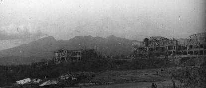 Parade Grounds, Pre-War Barracks, Bataan Mountains in background. |