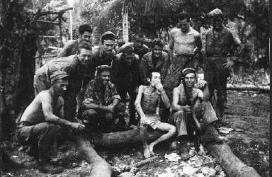 A recently captured Japanese POW puffs on cigarette with the men of B Company, 503rd PIR.