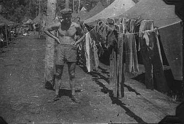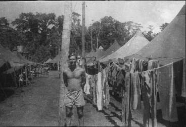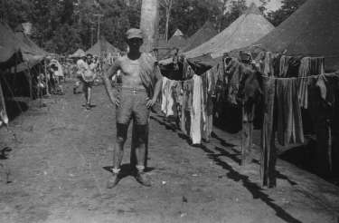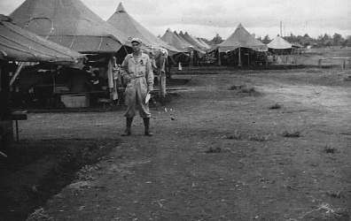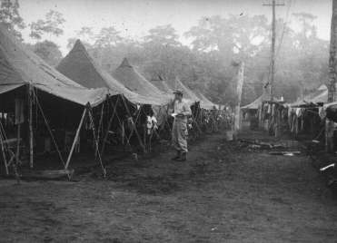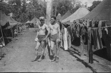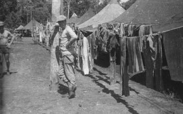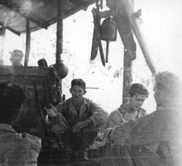 James Halloran (Hudson, NY) (rear, looking into tent) killed at Monkey Point, 1945, Charlie Hardman (KS), Jack Herzig (NJ) (front) |