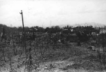 | Monkey Point--Site of tremendous suicidal explosion of the Japanese force, decimating 1st Battalion, 503rd; hurling tank 50 yards. The tank can be seen upside down against pole. Note the boulders that rained down on the battalion. | |